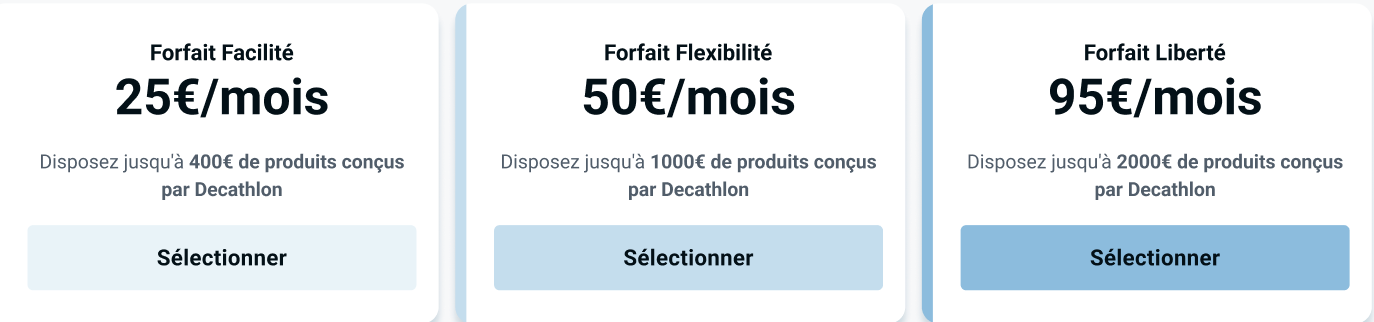 Les utilisateurs ont le choix entre trois formules, chacune leur permettant de disposer des produits conçus par Decathlon, jusqu’à un certain montant :